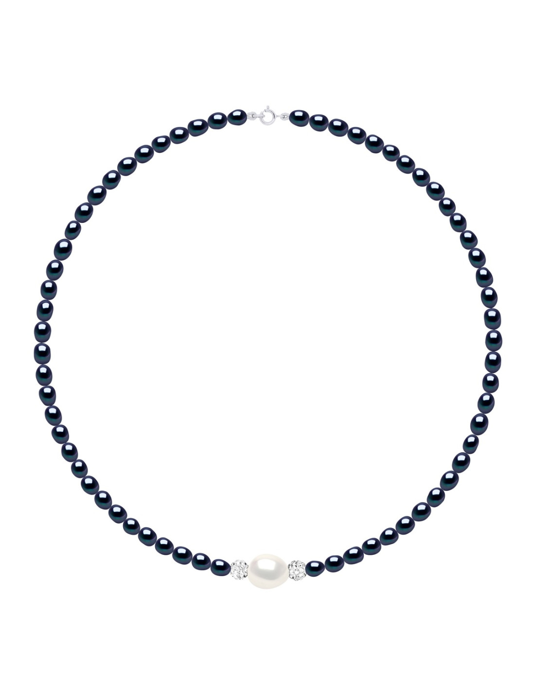 Süßwasser-Wasserkultur-Perlenkragen Reis 4mm schwarz Tahitianer Stil und 1 Barock 11-12 mm Natürliche weiße Farbe und und weiße Kristallperlen - Länge 42 cm -Fermoir Ringring - Silber 925/1000 Rhodium - kommt mit Echtheitszertifikat und internationaler Garantie - Herstellung in unseren französischen Workshops