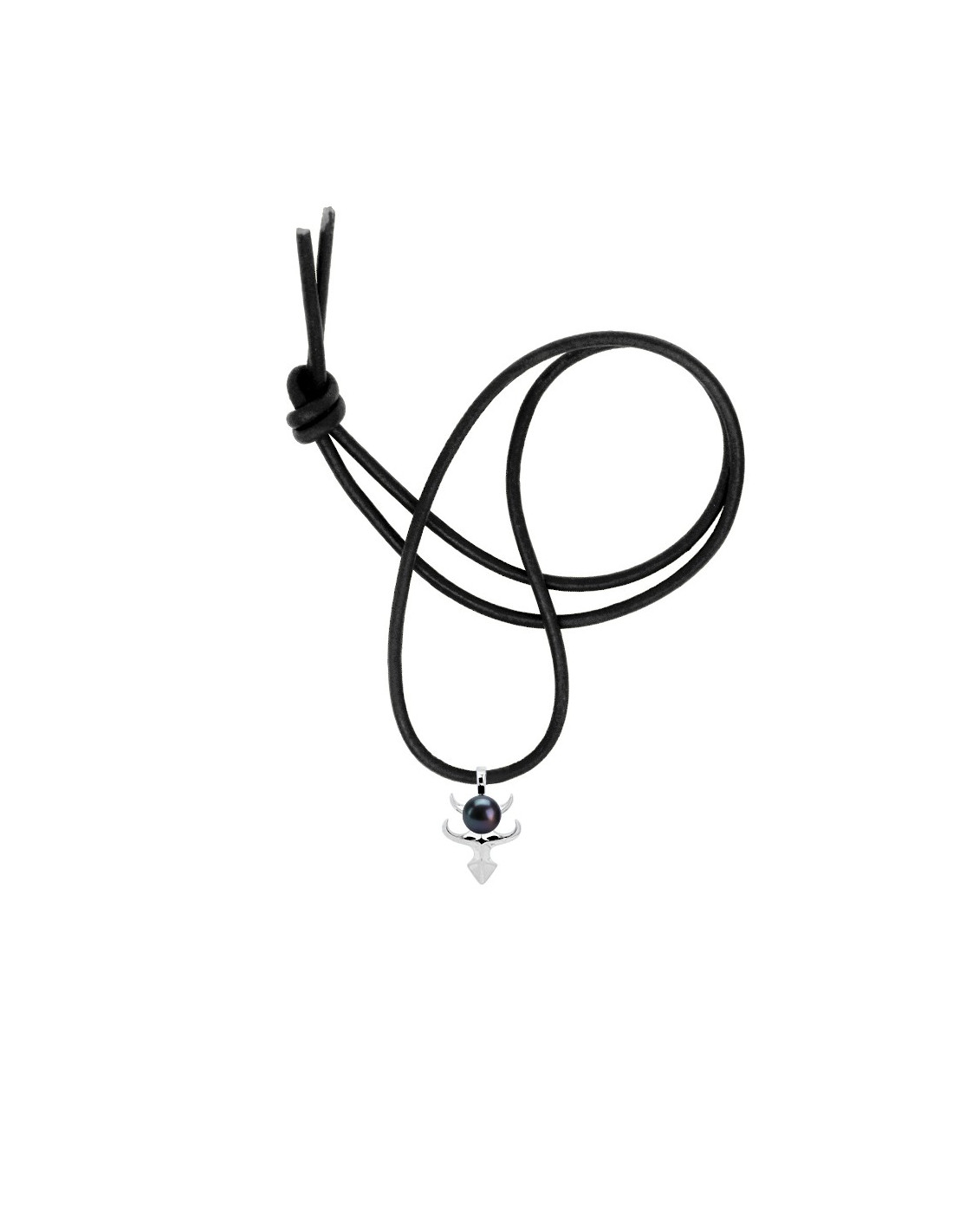 Necklace - Leather Link - Color Black - Rhoded Silver Silver Tribal Pendant 925 Thousandths Rhodium with a Real 9mm Freshwater Culture Pearl - Color Black Tahiti - Comes with Certificate of Authenticity and International Warranty - Manufacture in our workshops