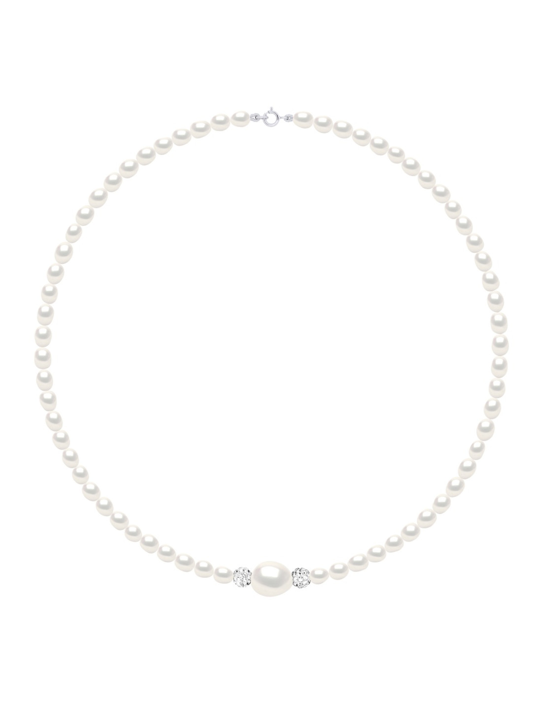 Freshwater Water Culture Pearl Necklace 4mm and 1 Baroque 11-12 mm Natural White Color and and White Crystal Beads - Length 42 cm -Fermoir Spring Ring - Silver 925/1000 Rhodium - Comes with Certificate of Authenticity and international warranty - Manufacture in our French workshops