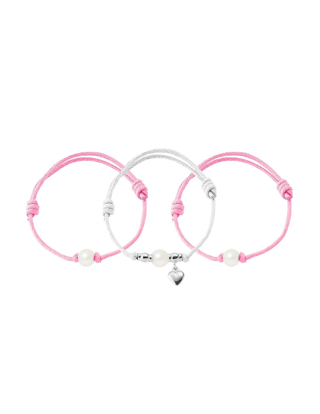 - Se compone de dos pulseras de perlas blancas y una pulsera blanca de perlas con un encanto de corazón
