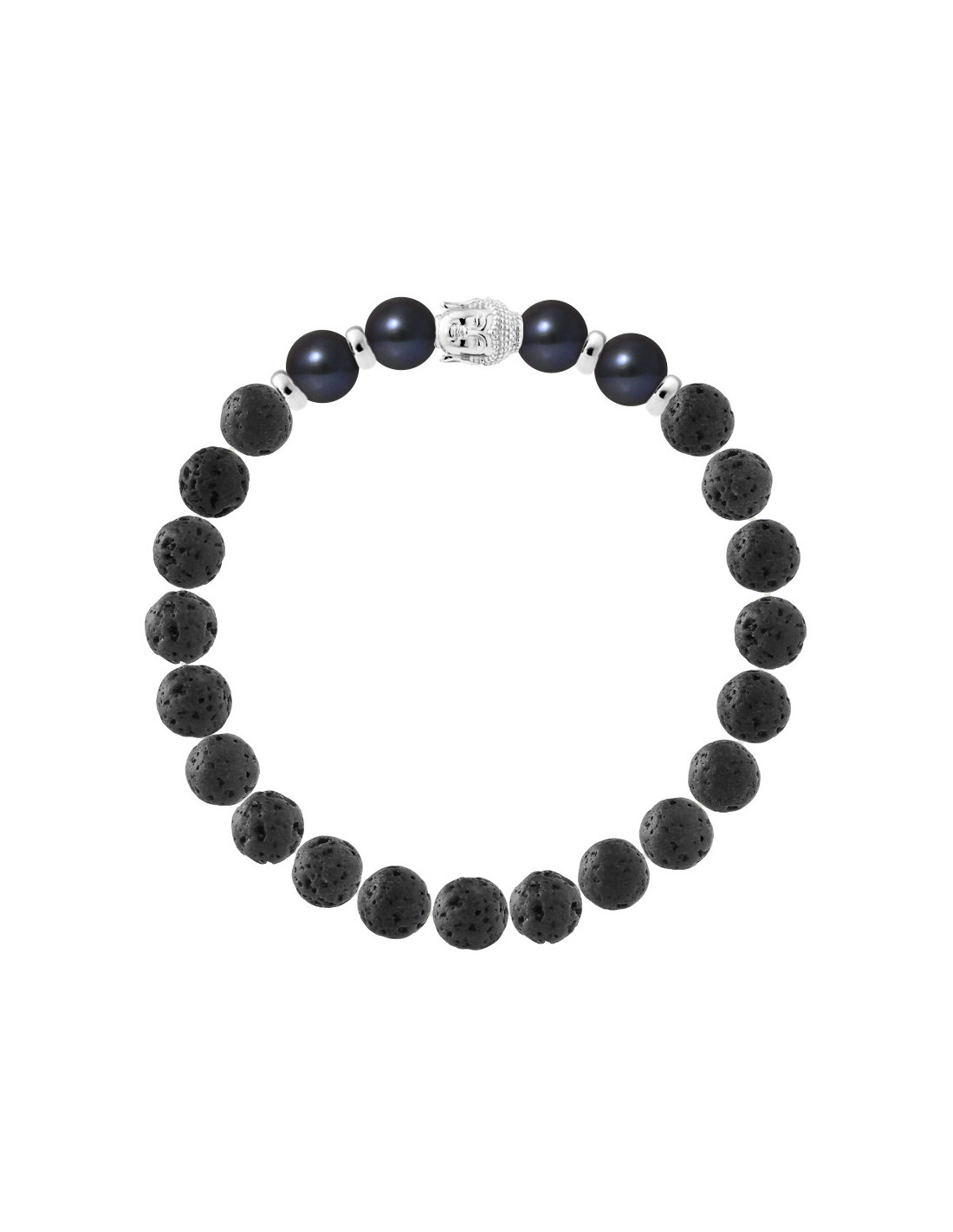 Pulsera tibetana Buddah - 4 cuentas genuinas de cultivo de agua dulce Semi Ronda 8-9 mm - Colori Black Tahiti - y piedra de lava natural - Buddah y plata de plata 925 milths Rhodium -elasticked - Suministrado con certificado de autenticidad e Garantía Internacional - Fabricación en nuestros talleres franceses.
