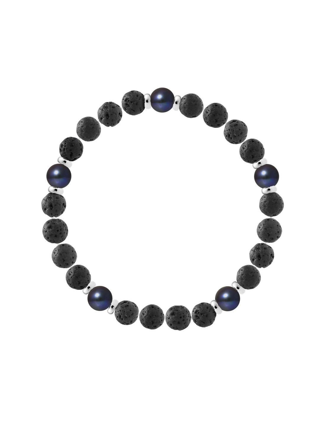 Pulsera Posibilidad - 5 cuentas de cultura de agua dulce redonda verdaderas 9-10 mm - Color Black Tahiti - 10 cerezas de plata 925 - Piedra de lava natural - Elástica - Viene con certificado de autenticidad y garantía internacional - Fabricación en nuestros talleres franceses