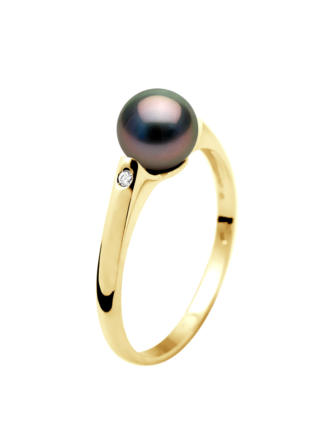 Anillo de joyería de oro, diamantes y cuentas tahitian redondas 7 mm - Rakenao