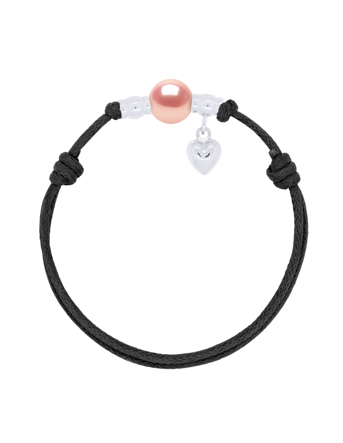 Bracelet Charm Coeur Argent Véritable Perle Noire Cordon Noire