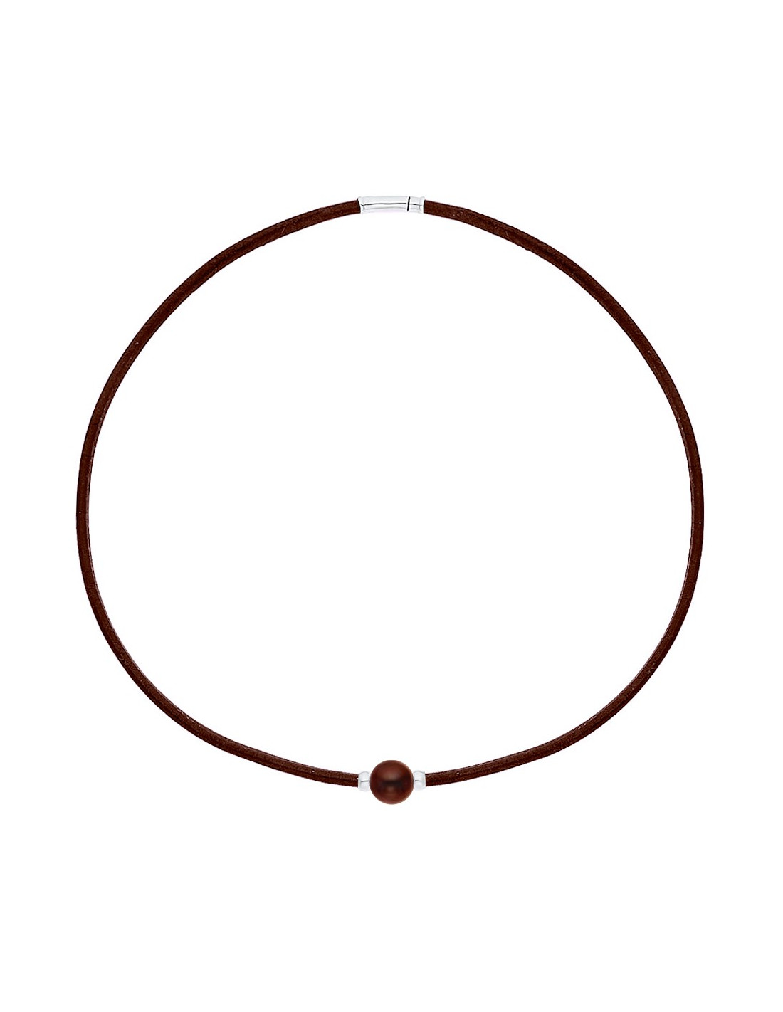 Collana in pelle marrone genuina perla e ciliegie d'argento